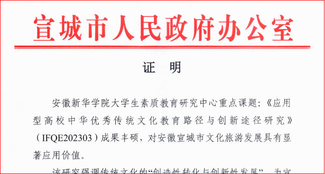 该课题研究强调传统文化的“创造性转化与创新性发展”,提出的“校地协同育人”的融合教育模式,以及打造地方特色文化品牌等具体方案,因其深刻的现实洞察力和强烈的实践指导性,获得了宣城市人民政府的高度认可,认为该研究成果“实用性强,对推动宣城文旅产业高质量发展具有明确的促进作用”。